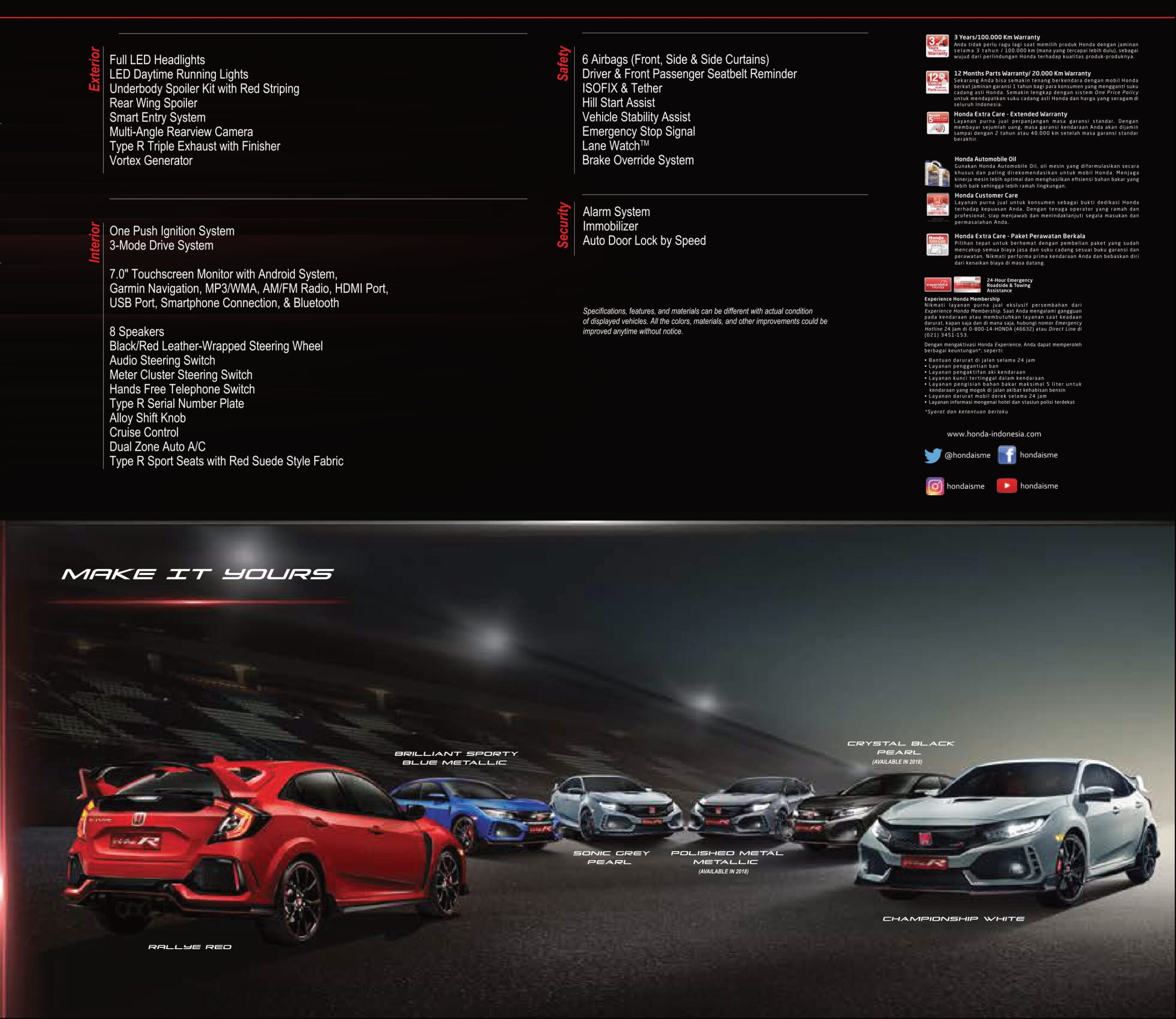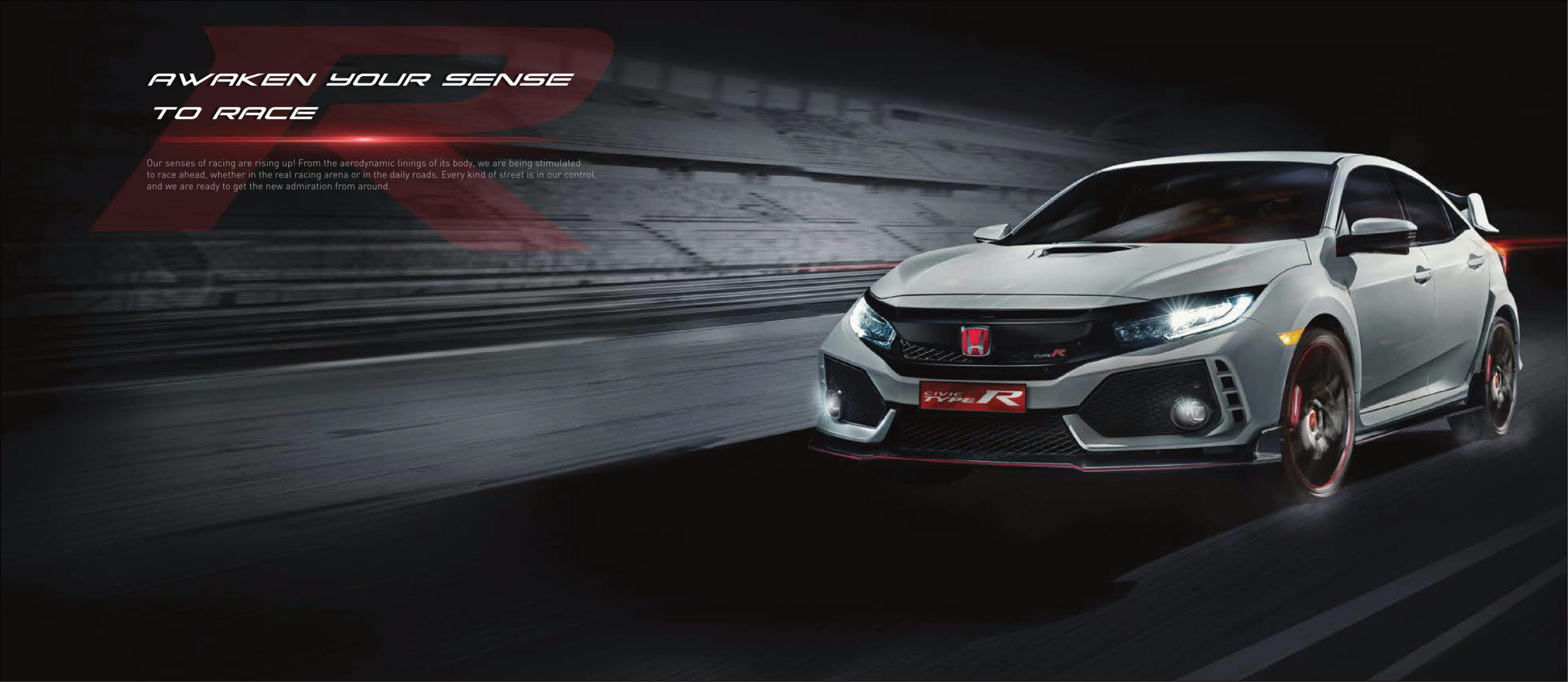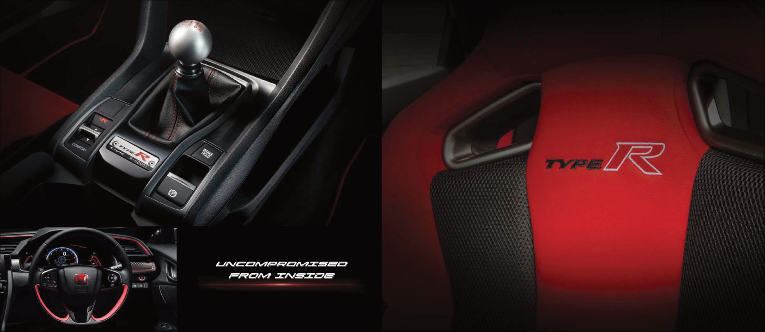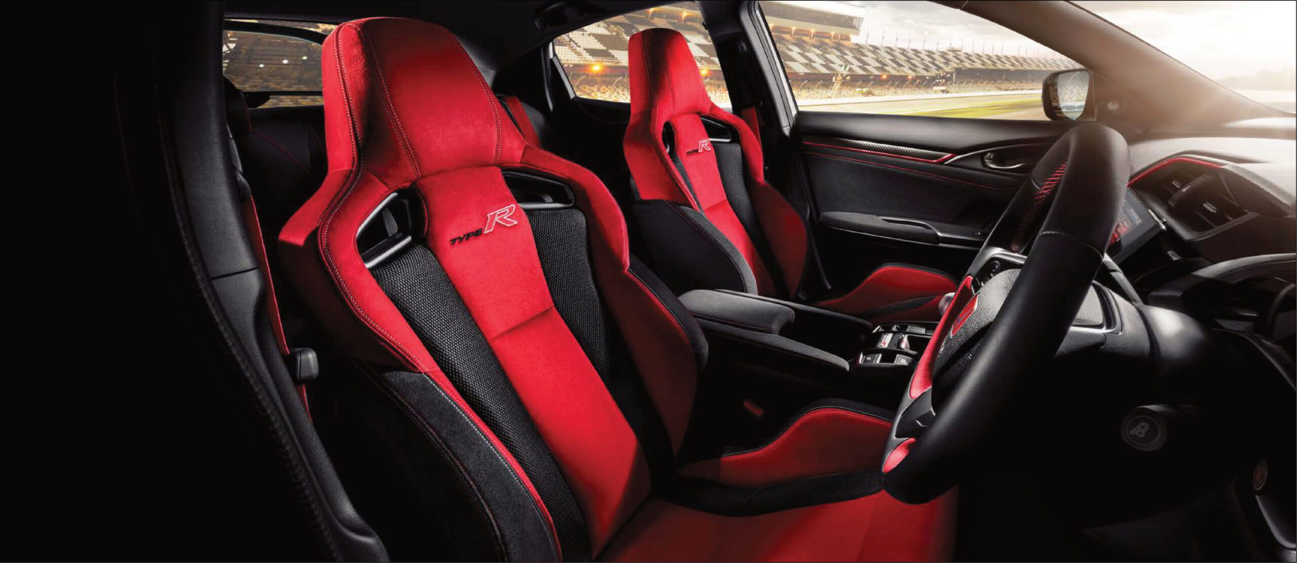 New Honda Civic Type R terbaru hadir dengan desain front bumper and rear bumper baru, lengkap dengan diffuser, rear wing spoiler, dan vortex generator. Secara keseluruhan, desain eksterior mobil ini sangat keren. Apalagi ada tambahan side skirt, carbon effect fiber serta underbody spoiler kit yang menambahkan kesan sporty plus full LED headlights dan LED daytime running lights yang memancarkan aura modern. Pelek alloy berukuran 20 inci dengan agresif dengan fitur tire pressure monitoring system untuk memonitor tekanan angin yang dapat terlihat pada panel instrumen.