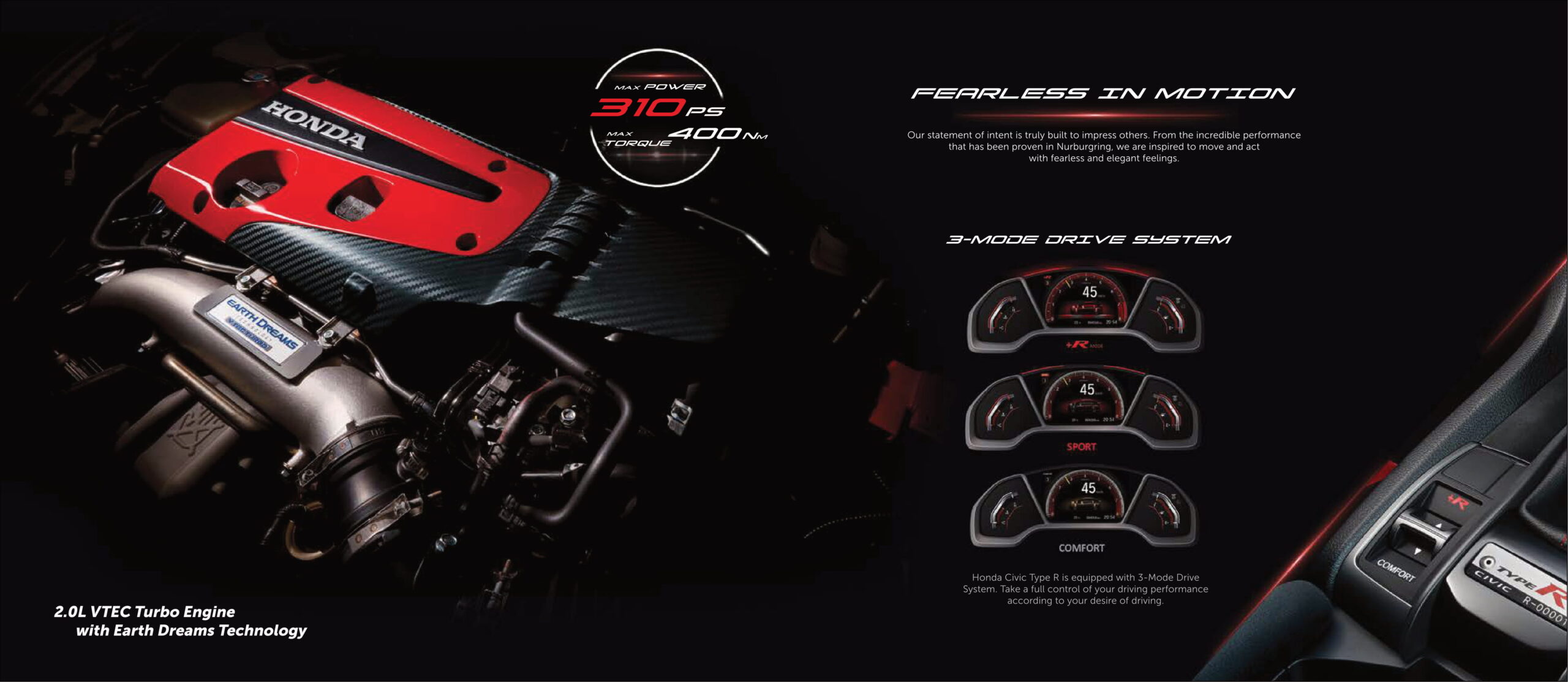 New Honda Civic Type R dibekali mesin 2.0 liter VTEC Turbo yang mampu menyemburkan tenaga maksimal 310 PS pada 6.500 rpm dan torsi maksimal 400 Nm pada 2.500–4.500 rpm.