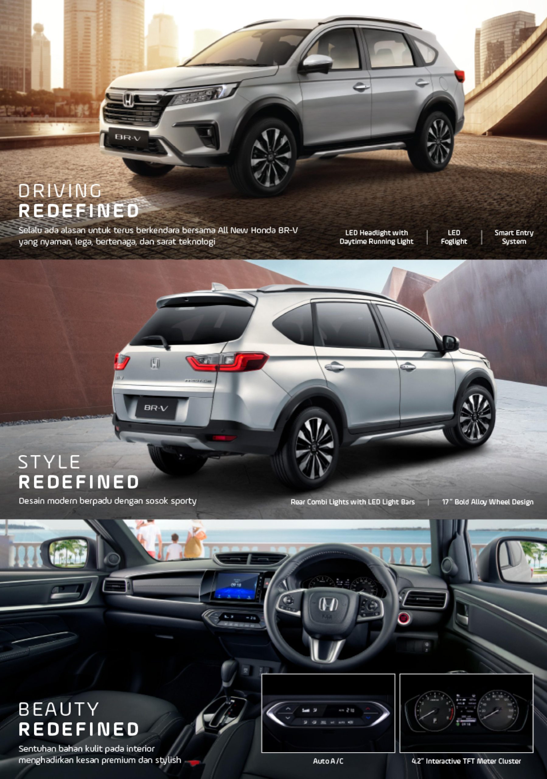 All New Honda BR-V hadir dengan tampilan modern yang sudah dilengkapi LED Light, Smart Entry, dan 17” Bold Alloy Wheel Design yang memancarkan karakter sebuah SUV keluarga premium dan sporty.