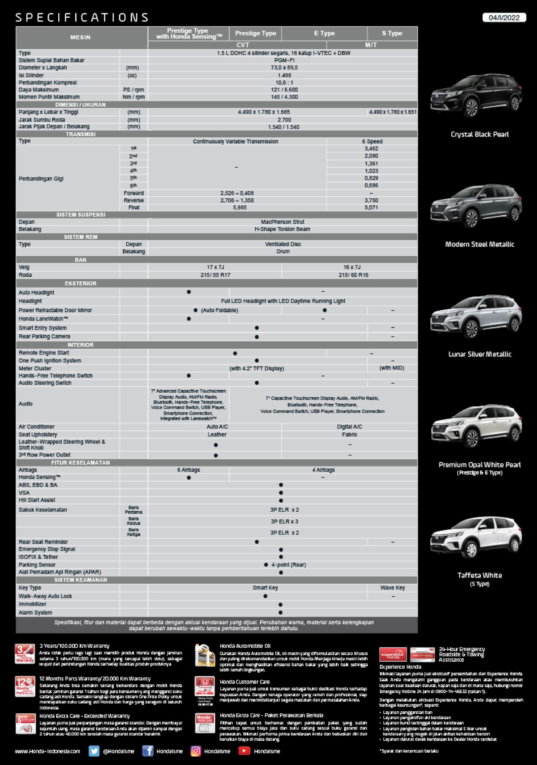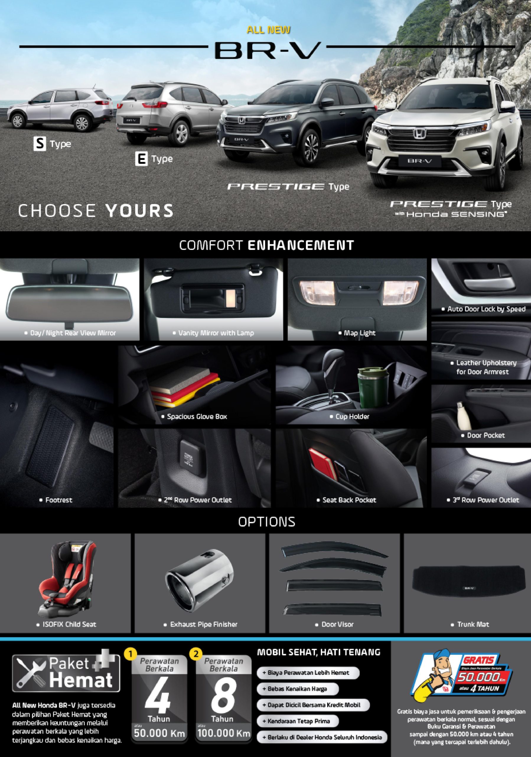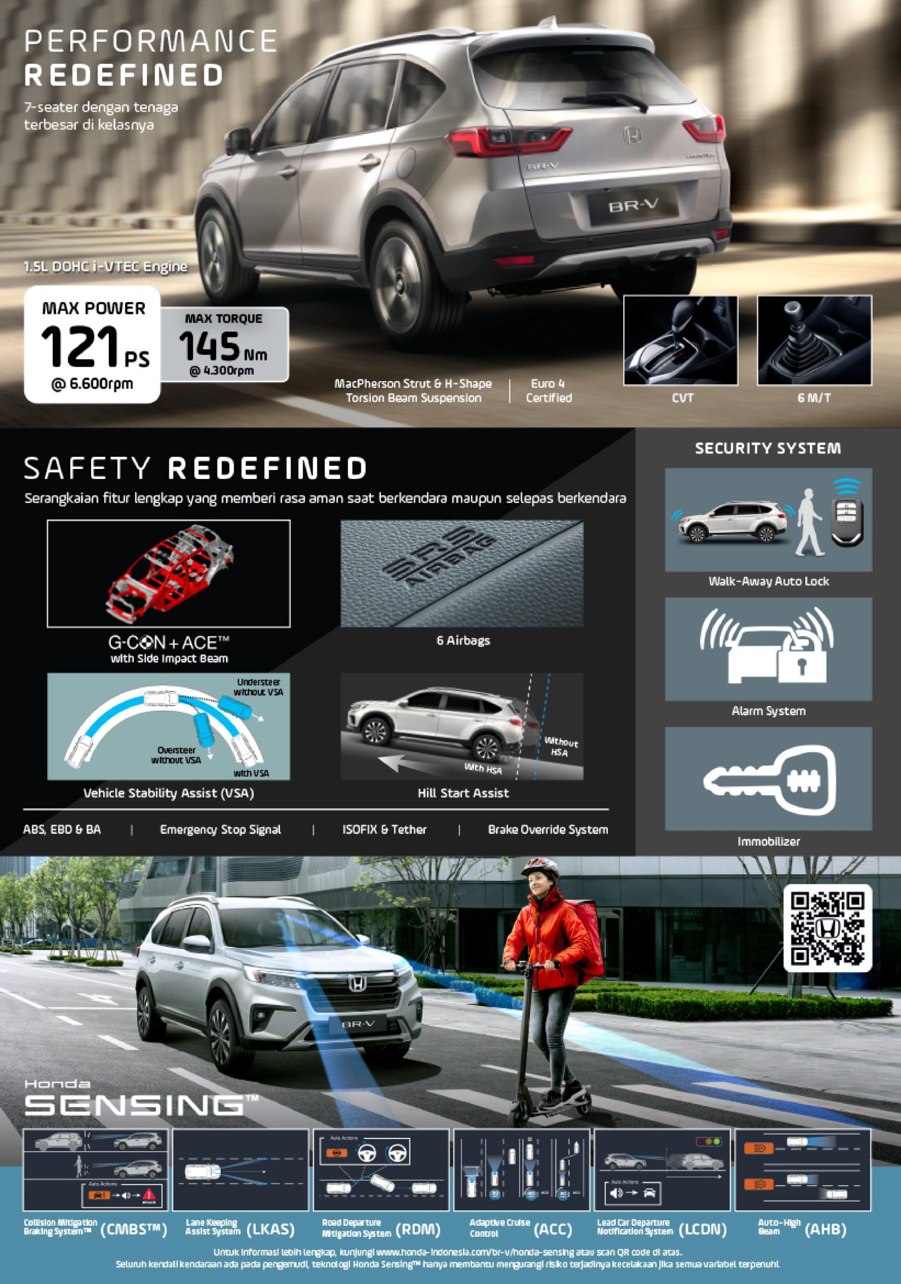 Dengan tenaga 121 PS yang tertinggi di kelasnya, All New Honda BR-V memberi kepuasan berkendara. SUV ini dilengkapi Honda Sensing™ yang akan membuat perjalanan Anda dan keluarga semakin aman dan nyaman.